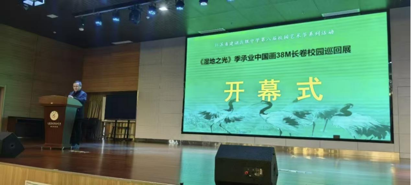 11月21日,阳光洒满书香校园,江苏省建湖高级中学艺文展厅内人头攒动,《湿地之光》季承业中国画38米长卷校园巡回展开幕式在此举行。市文联党组书记、主席罗时荣出席活动并致辞,市政协副主席丁成宣布展览开幕。