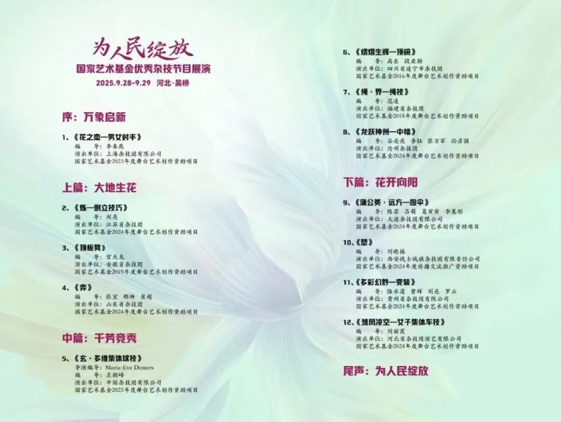 9月28日至29日,“为人民绽放——国家艺术基金优秀杂技节目展演”在河北吴桥江湖大剧院圆满举办。此次展演由国家艺术基金管理中心、河北省文化和旅游厅联合主办,是国家艺术基金资助成果的一次集中亮相。江苏省杂技团节目《炼——倒立技巧》受邀参演。